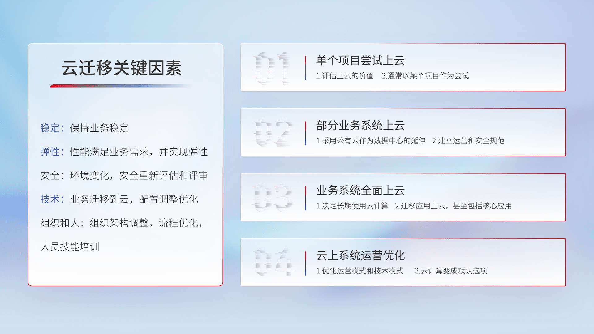 结合实际业务,,从规划设计、、、、云平台选型、、、、云原生改造、、、、数据迁移、、集成交付,,,迁移全过程为客户识别最佳上云路径,,,,做好风险识别管理,,,设计网络架构、、身份权限、、、、安全审计合规、、、操作审计、、、日志审计、、、、监控告警策略、、多站点容灾设计等,,,对云上基础设施进行整体规划,,,,提升IT治理水平,,以满足弹性、、高可用、、、高性能的需求。。。。