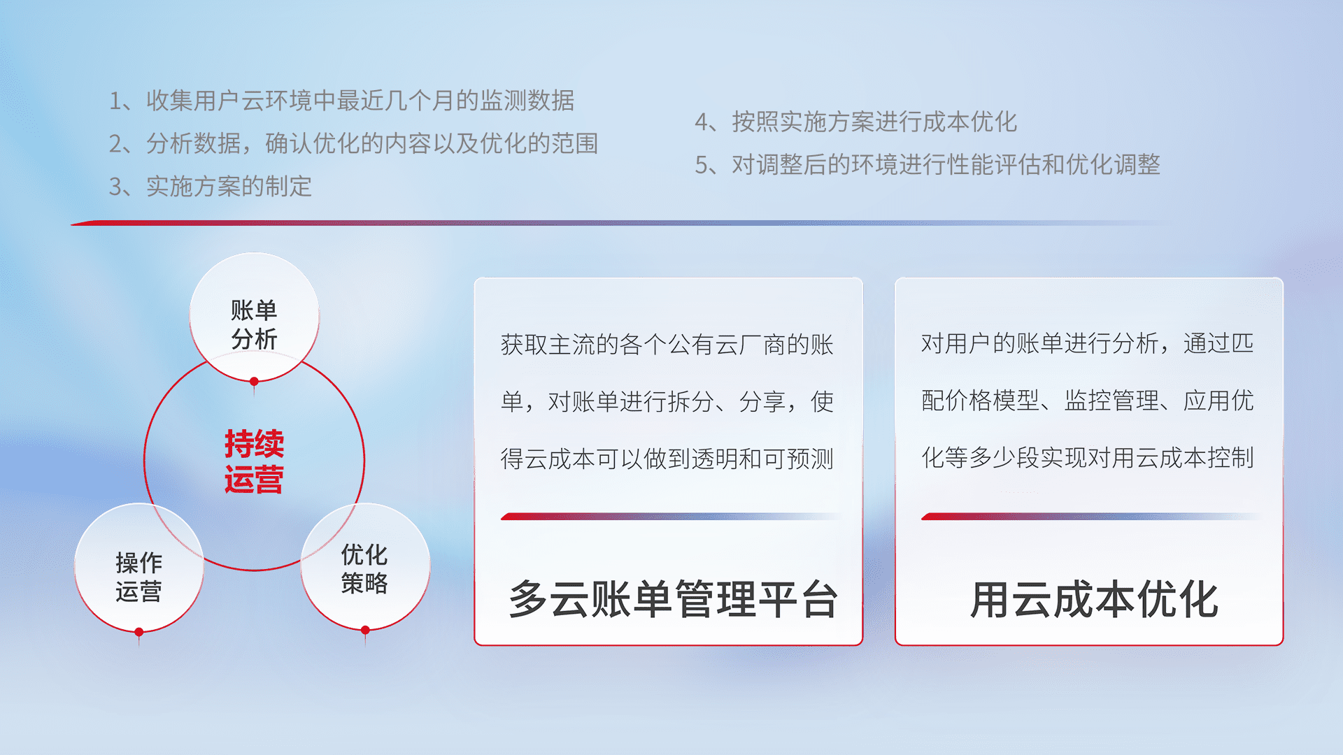 通过多云纳管,,,,以统一的资源数据模型把客户的云资源进行抽象和封装,,,,进而实现对多云资源的统一操作,,保障云资源管理的可靠性、、、、稳定性与可用性。。量身定制化运维内容,,,配置、、、、开发运维、、补丁管理、、、备份、、、监控、、、、认证和访问管理、、、、审计和日常巡检等,,保障在用云过程中的可靠度,,,,稳定度以及高可用率。。。。
